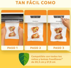 Compatibilidad con bolsas y rollos FoodSaver: La VS0290X está preparada para trabajar con rollos y bolsas de 20 cm y 28 cm de ancho, lo que ofrece una gran flexibilidad para envasar desde pequeñas porciones hasta grandes piezas de carne. Además, incluye un cortador integrado para ajustar el tamaño de las bolsas, algo súper práctico para evitar desperdicios de material.